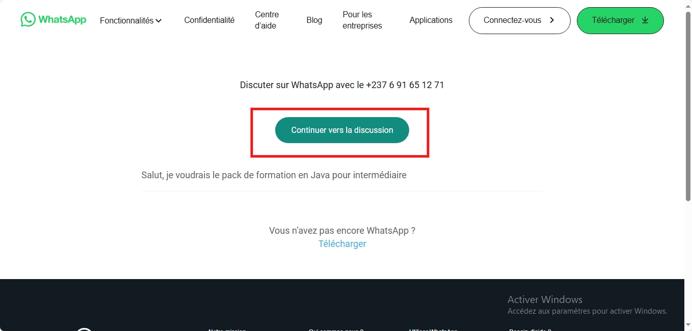 Cliquer sur :continuer vers la discussion pour entrer en possession de votre pack de formation :